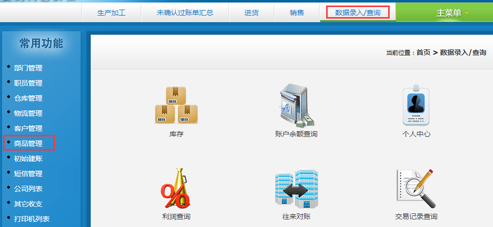 第一步:點擊“數(shù)據(jù)錄入/查詢”模塊,然后在右側(cè)子常用功能下面找到“商品管理”,選擇此菜單,如圖: