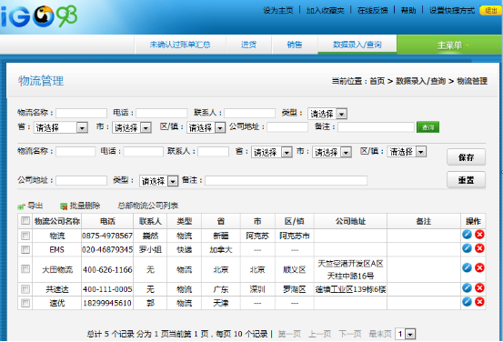 ● 在物流名稱、電話、聯(lián)系人等輸入框里填入關(guān)鍵字,點擊“查詢”按鈕,可對部門信息表進行查詢。