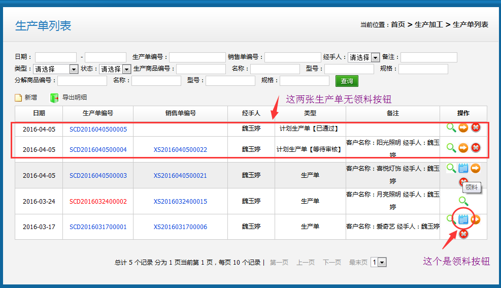 如截圖,有兩張生產(chǎn)單是沒有【領(lǐng)料】按鈕的,可以看到“類型”下面,這兩張生產(chǎn)單是“計劃生產(chǎn)單”,計劃生產(chǎn)單是缺配件的情況下需要啟動的,也就是需要進(jìn)行“采購”,所以需要采購入庫之后,該生產(chǎn)單才會出現(xiàn)【領(lǐng)料】按鈕。